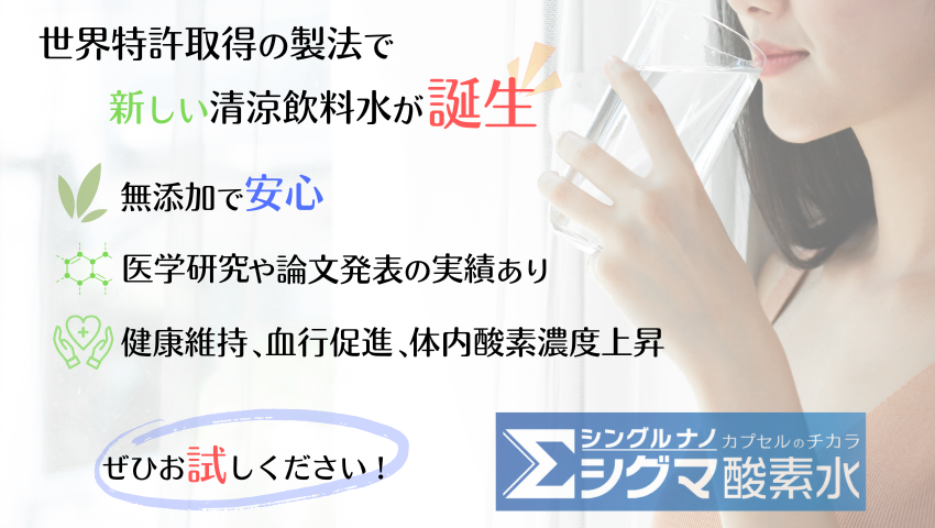 弊社保有の特許第5555892号を用いて当社工場で製造された清涼飲料水です。最新技術を用いた酸素ナノバブル水で、毎日の健康促進に最適です。